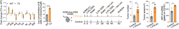 基于LARS B的亮氨酸依赖性特点,研究人员提出了一种安全有效的亮氨酸节律饮食方案(7天为一个周期:4天正常饮食,3天亮氨酸缺失饮食),该饮食方案显著抑制LARS B细胞介导的结直肠癌免疫逃逸,减缓了肿瘤进展(图3)。这个氨基酸节律饮食 ,对临床肠癌的防治和患者的个人饮食管理提供应用潜能。