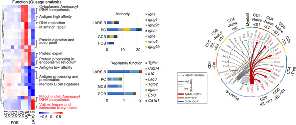在该项研究中,研究团队通过收集小鼠CRC局部组织,分选肿瘤浸润CD45+细胞进行单细胞测序,分析发现LARS B亚群独立于FOB、GCB和PC亚群,以高表达Lars2为主要特征(图1)。细胞表型上,LARS B类似浆细胞前体细胞,表达浆细胞驱动基因Prdm1,但抗体分泌能力较低,Cd138低表达,相反高表达抑制性分子Tgfb1,与Treg细胞通讯密切。组织定位上,LARS B散布于TLS以外的肿瘤间质,在正常组织以及骨髓、脾脏、外周血极少存在。进一步,研究人员通过收集临床CRC患者的肿瘤组织、息肉和配对的正常组织及外周血,证实LARS B也存在于CRC患者。90例CRC患者的组织芯片染色结果显示,组织内LARS B的富集与不良预后呈现正相关。