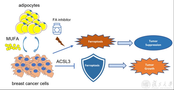 本研究首次发现脂肪细胞在调控三阴性乳腺癌铁死亡中的关键作用并揭示了其机制,完善了学界对乳腺癌微环境和铁死亡关系的认识,并提供了未来的潜在治疗靶点。