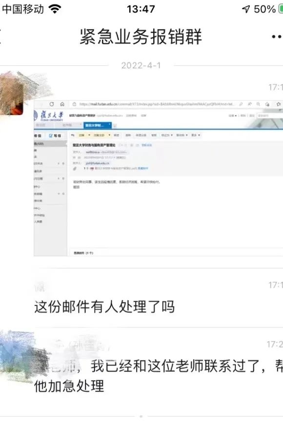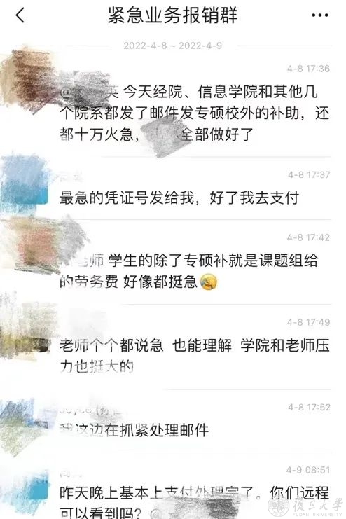 封闭期间特别组建的 “紧急业务报销群”汇集了财资处各个办公室的老师,有人负责多方协调,有人负责盯紧进度,加急处理着最紧急的财务事宜。