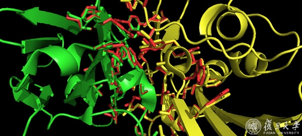 使用OPUS-Mut对蛋白质复合物接触面氨基酸的侧链建模结果,绿色和黄色为两个蛋白的真实构象,红色为预测侧链