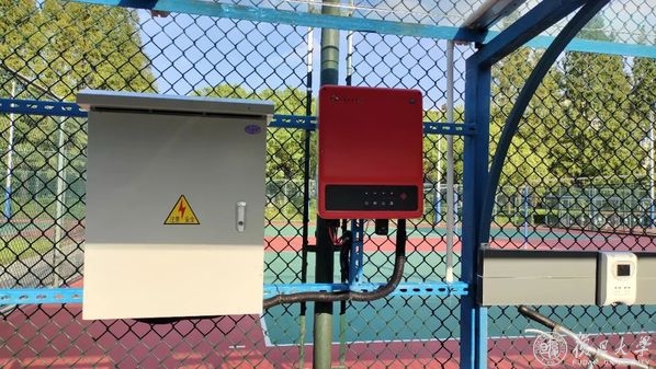 2021年开始,学校进行了光伏车棚试点改造工作,在邯郸校区南区学生公寓排球场西侧的自行车车棚彩钢瓦顶拆除,更换成兼具遮雨、发电、科技感装饰等功能的光伏组件车棚,光伏组件发电通过逆变器就近接入校内配电网,实现了自发自用。