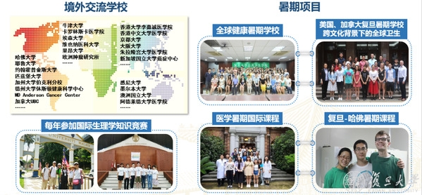 复旦上医目前与美国哈佛大学、哥伦比亚大学、约翰霍普金斯大学、斯坦福大学、加州大学戴维斯分校、加拿大UBC、阿尔伯塔大学、德国杜伊斯堡-埃森大学、澳大利亚悉尼大学、墨尔本大学、瑞典隆德大学、日本京都大学、香港大学等众多大学医学院签订协议,每年选派优秀学生公费前往交流。