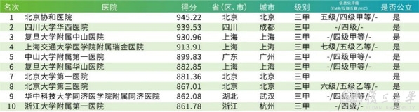 复旦上医现有中山、华山、肿瘤、妇产科、儿科、眼耳鼻喉科医院等直属附属医院,医疗实力雄厚。最新公布的中国公立三甲医院绩效考核中,全国仅有复旦上医与北医拥有两家附属医院进入全国十强,其中中山医院上海排名第一。