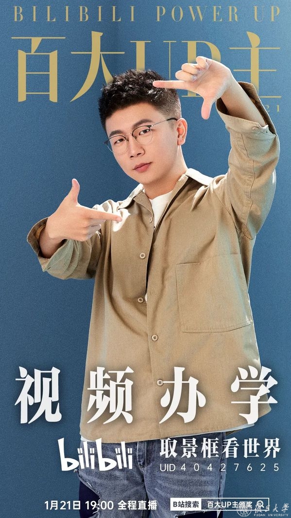 凭借一系列内容充实,具有启迪意义的视频,周薪吉“取景框看世界”去年被评为“2021百大UP主”。在宣传海报上,B站以“视频办学”四个字为文案。