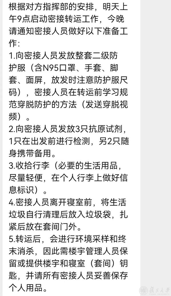 人性周到的细节安排也是学校转运工作中的重要特点。每次转运前,防控办都会组建转运工作群,提前将要求和流程告知大家,同时预先了解人员情况需求,确保每一步手势不乱不错。