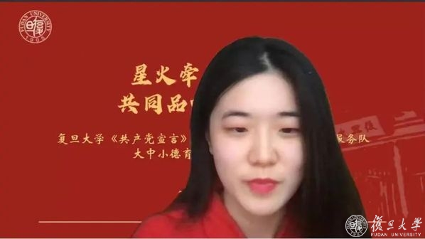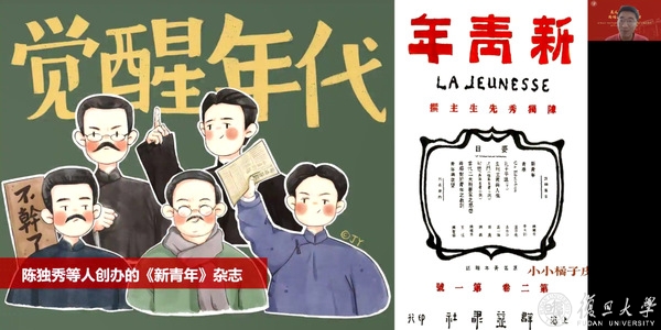 屏幕上手绘的可爱历史人物,配上卡通字体的觉醒年代,6月10日下午,2020级马克思主义学院硕士生,“星火”队队员杨宁,正在线上举办的大中小德育一体化(下文简称:大中小一体化)集体备课会上,给来自复旦大学附属中小学“望道”党史研习社的师生代表讲授《陈望道和可爱的青年们》这门课。几个星期后,便是习近平总书记回信“星火”队两周年的日子。