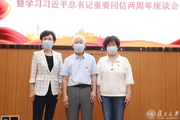 随后,在邯郸校区逸夫科技楼,举行了庆祝中国共产党成立101周年暨学习习近平总书记重要回信两周年座谈会。座谈会上,焦扬为他们佩戴党员徽章。