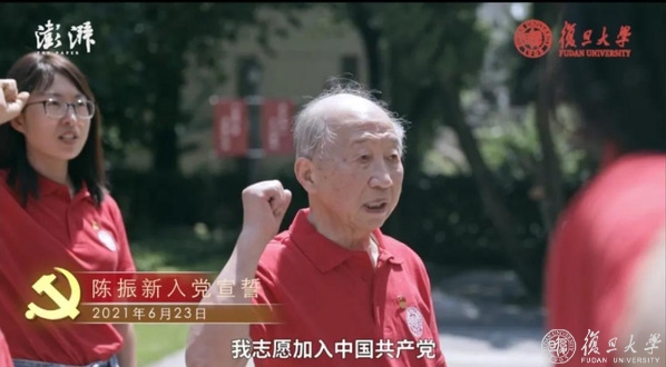 习近平总书记给复旦大学《共产党宣言》展示馆党员志愿服务队全体队员回信两周年之际,陈振新同志按期转正。“经过这一年的培养教育,陈振新同志政治信仰愈发坚定,能够自觉以共产党员标准严格要求自己,传扬宣言精神,用红色基因铸魂育人。虽是耄耋之年,还是严格要求自己做‘宣言精神’的忠实传人。”校党委书记、陈振新的入党介绍人之一焦扬介绍,在过去的一年,陈振新参加大量建党百年活动,用独特的经历,向广大青少年传扬伟大建党精神;数次接受媒体采访、数次走入大中小学,传播信仰的力量。