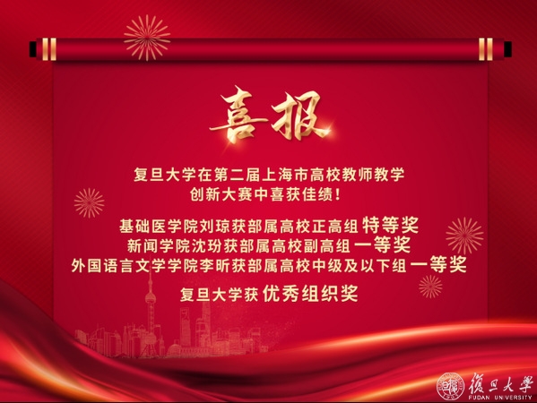 2022年6月23日,上海市教委公布了第二届上海高校教师教学创新大赛的获奖名单。其中我校基础医学院刘琼获部属高校正高组特等奖、新闻学院沈玢和外国语言文学学院李昕分别获得部属高校副高组和中级组一等奖,复旦大学获得优秀组织奖。刘琼教授代表上海部属高校正高组参加全国赛。