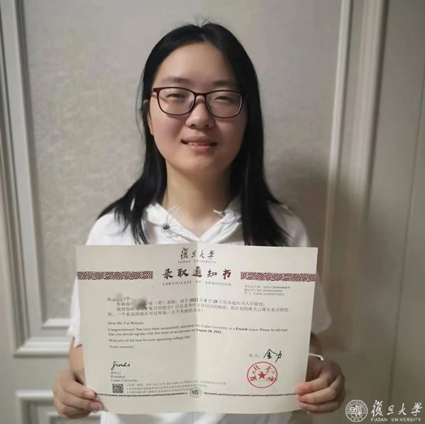 复旦大学首批本科录取通知书,已奔赴117名录取考生。其中,以总分621分被录取至复旦大学法语专业(提前批)的蔡雯玥同学在7月11日已收到。