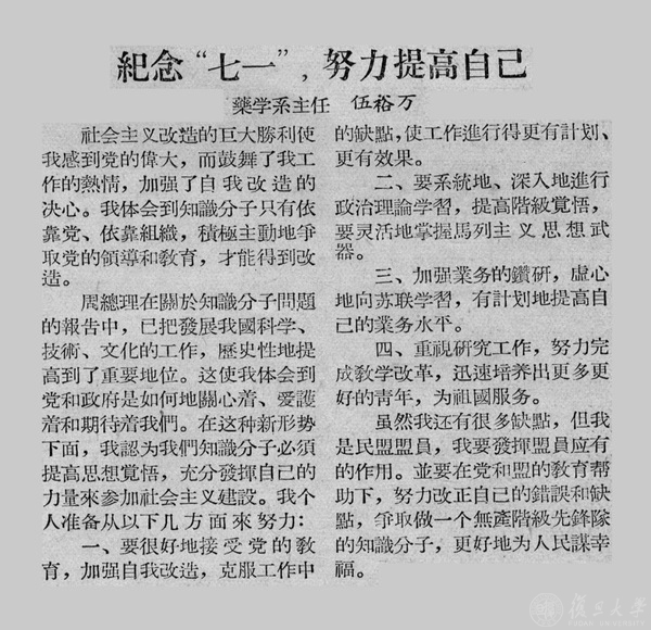 伍裕万作《纪念“七一”,努力改造自己》