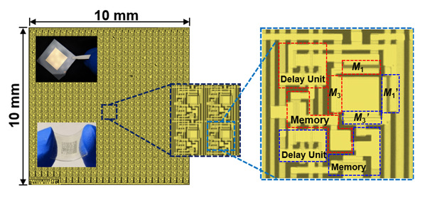 图. 基于二维半导体的机器视觉增强芯片。右边放大的每个单元像素电路中集成了信号“传感-存储-计算”功能。