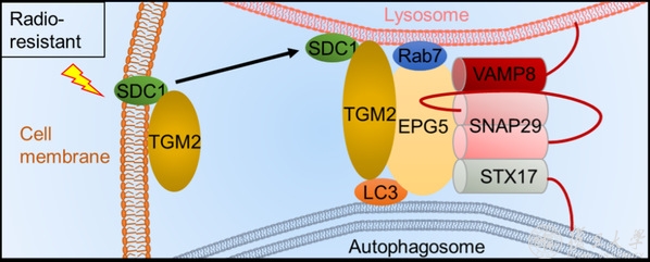 2022年8月1日,复旦大学放射医学研究所邵春林教授团队在Autophagy上在线发表题为“SDC1-dependent TGM2 determines radiosensitivity in glioblastoma by coordinating EPG5-mediated fusion of autophagosomes with lysosomes”的研究论文,该研究揭示了胶质母细胞瘤中转谷氨酰胺酶TGM2通过多配体聚糖SDC1依赖的方式转运至溶酶体,促进束缚因子EPG5介导的自噬体-溶酶体融合,最终增强肿瘤的辐射抵抗,为胶质母细胞瘤放疗提供新的潜在增敏靶点。