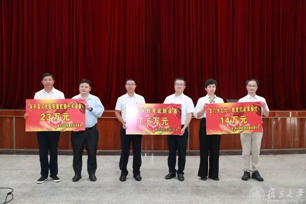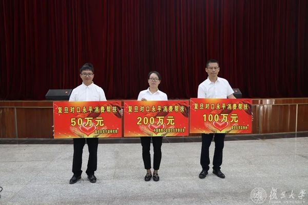 上海复旦大学教育发展基金会永平乡村振兴教育基金、青岛科文集团永平振兴教改基金和奖学金、附属妇产科医院腹腔镜手术设备等一批集中捐赠项目公布。学校相关部门代表和上海朗亿功能材料有限公司、禄亘仪器设备(上海)有限公司等作为捐赠方代表向永平等捐赠相关基金及医疗、教学设备。永平县商务局上台展示校工会、总务处及宁波研究院等机构采购永平农特产品意向和牵线企业情况。学校师生、校友、爱心企业,通过“以购代捐”“以买代帮”等多种消费帮扶方式,帮助永平农特产品企业、合作社发展壮大,促进农民增收,助推乡村振兴。