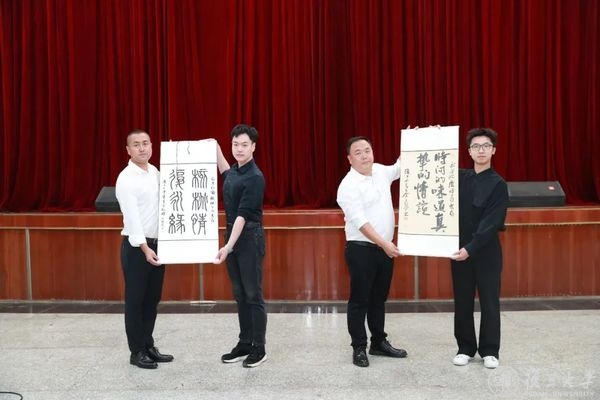 学校支教研究生为永平县爱心企业代表红喻核桃、阿庆嫂食品两家企业送上致谢书法作品“核桃情,复永缘”“时间的味道,真挚的情谊”。今年上海疫情期间,永平爱心企业千里驰援复旦,校工会、书篆刻研究会成员周桂发和王联合连夜为爱心企业创作了这两幅书法作品,展现复旦与永平之间的绵长情谊。