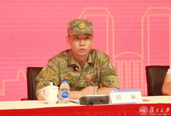 军训团团长顾敏少校代表全体参训的官兵,向2022年学生军训正式开训表示热烈祝贺,向复旦大学全体师生致以崇高敬礼。