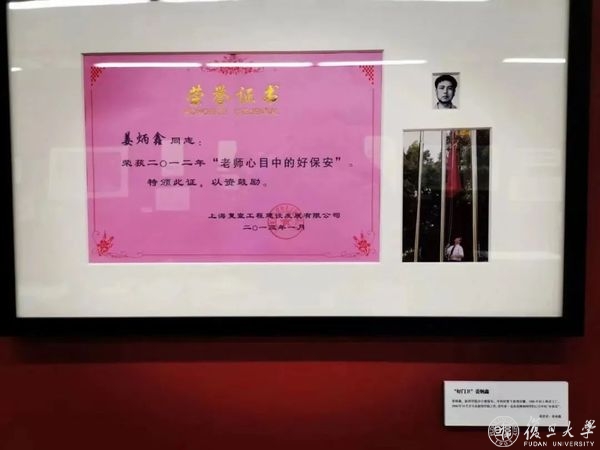 在新闻学院90周年院庆文献展上,写着他名字的奖状与许多教师和杰出系友的作品并列——“姜炳鑫同志:荣获二〇一二年‘老师心目中的好保安’”。