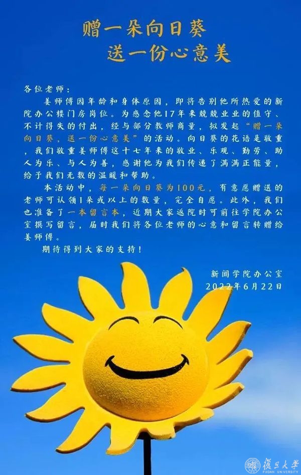 学院得知姜师傅的家庭情况后,曾发起捐助,教师们都积极响应。这次姜师傅正式退休,教师们又发起了“赠一朵向日葵”的活动,还在传达室门口放了给姜师傅的留言本,感谢他十七年的付出。