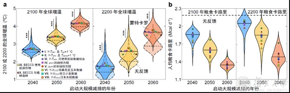 何时应启动实施大规模低碳技术?启动的不同时间段将相应产生怎样不同影响?在共享社会经济路径减排的基础上,课题组模拟了在2030-2100年内的不同时间开始减排的各类情况,考虑了拓展农业土地、增强氮肥施肥强度、提高施肥效率、植树造林、国际粮食贸易等综合性方案,在全力满足未来的全球粮食需求的情况下,评估了在2030-2200年期间由于推迟减排导致BECCS减排潜力下降的反馈作用,进而探寻该作用对未来全球增温和人均每日卡路里的影响。