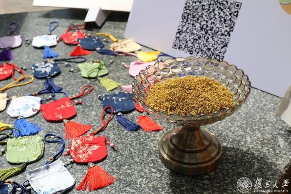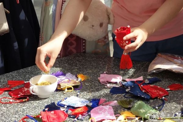 大家一起调制桂花香料,制作祈福香囊。