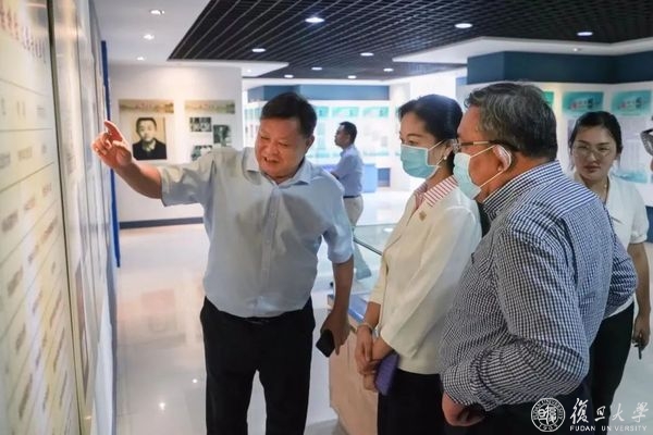 金力一行参观了安徽大学“双一流”建设成果展及“电镜中心”“极端条件实验中心”等大型高端仪器科研平台,到安徽大学校史红色基因专题展、复旦校友李世雄教授纪念馆调研学习。