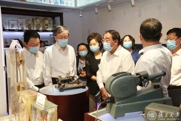 随后,丛斌一行来到枫林校区东苑,先后参观了福庆广场、人体科学科普教育基地,复旦大学上海医学院基础医学院教授、九三学社复旦大学委员会原副主委、上医分委员会原主委周国民作讲解。