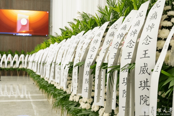 灵堂正中挂着王威琪院士的遗像,两侧挽联上写着“躬耕一生寒暑波联国际声振海外 执教杏坛甲子泽被后学风传千秋”。院士已去,安卧鲜花丛中。