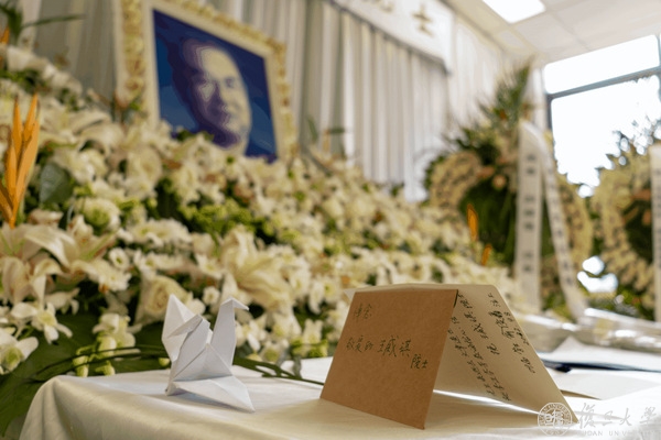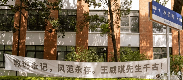 复旦校园内,师生们敬上的卡片与白菊放满了王院士在恒隆物理楼的灵堂。缅怀他的横幅悬挂于邯郸校区恒隆物理楼与江湾校区二号交叉学科楼前。