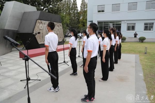 仪式开始,全场响起雄浑高亢的《义勇军进行曲》旋律。马克思主义学院望道班同学代表缓步上前,面向烈士雕塑唱响中国共产主义青年团团歌《光荣啊,中国共青团》。