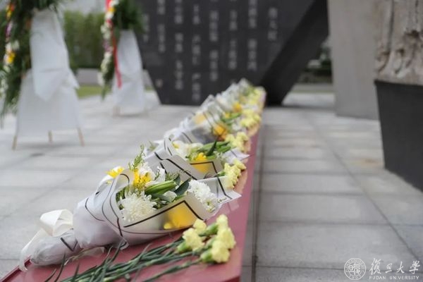 由复旦大学全体师生敬献的花篮,红底缎带上的“革命先烈永垂不朽”金色大字,格外醒目,熠熠生辉。