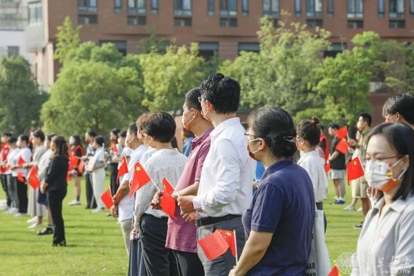 在场师生员工肃穆而立,齐唱国歌,对国旗致以注目礼