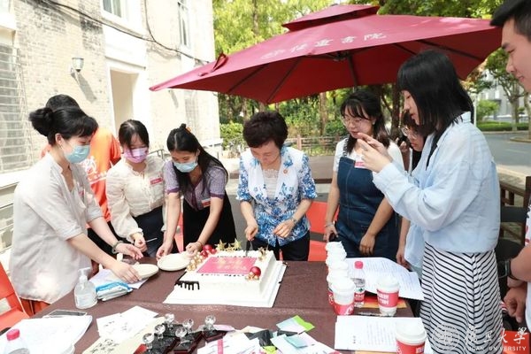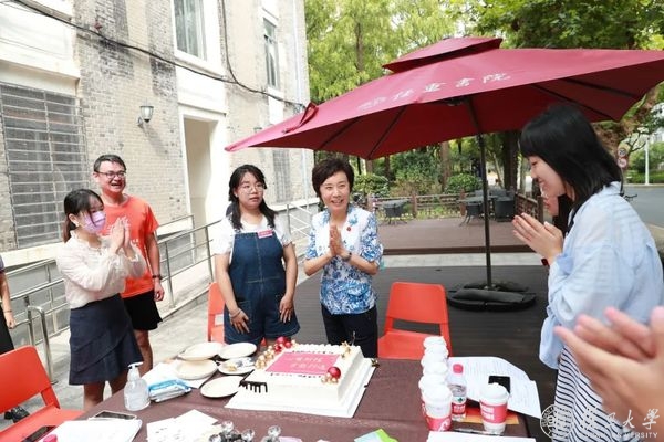 焦扬表示,同学们为了自己热爱的前辈、奠定复旦红色基因的老校长陈望道,聚在一个团队,弘扬一种精神,传扬真理的味道,把老校长的故事一代一代讲下去,让每一个复旦人为老校长而自豪。希望同学们能尽快融合到剧情中,以艺术的形式讲好“大先生”的故事,让更多的同学受到感染,同时她也祝愿同学们在校园里度过愉快的国庆节。书院给剧组同学惊喜,送上写着“真理的味道非常甜”字样的蛋糕。焦扬与同学们切分蛋糕,合影留念。
