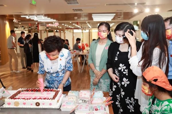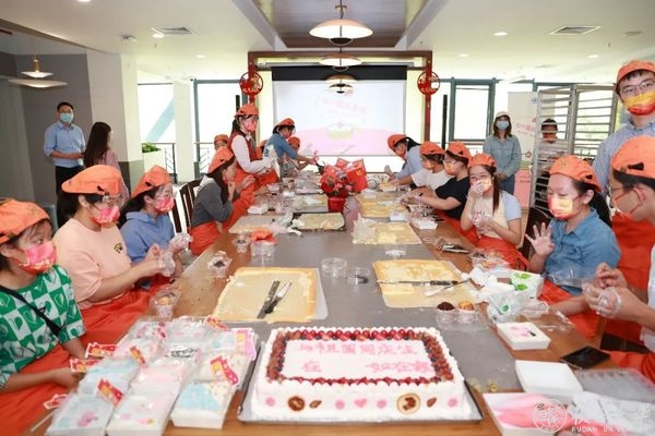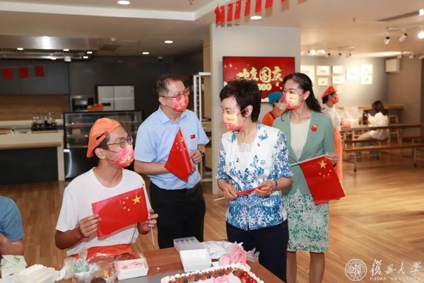 带着厨师帽、系着围裙,在北区食堂二楼劳动教育实践基地,在校的师生们正在忙碌地DIY蛋糕。焦扬一行也参与其中,为蛋糕裱花,写下“与祖国同庆生,在旦旦如在家”,与师生共同完成蛋糕制作,并将蛋糕分享给坚守岗位的后勤员工。
