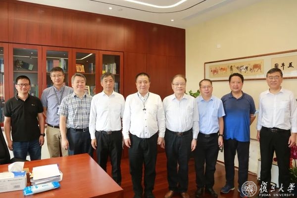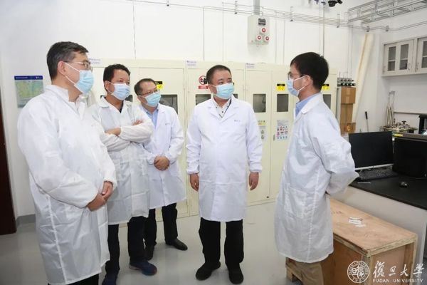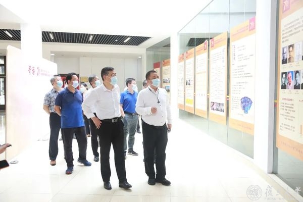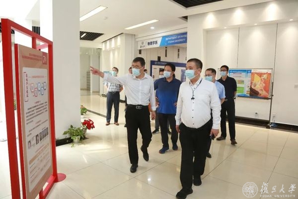金力一行来到物理楼,在应用表面物理国家重点实验室基地平台建设展板前驻足观看,听取物理学系工作汇报。
