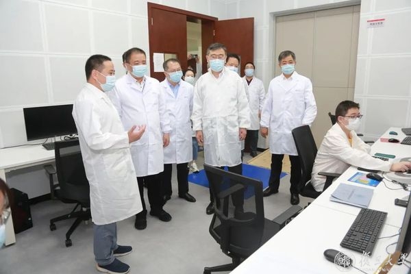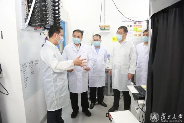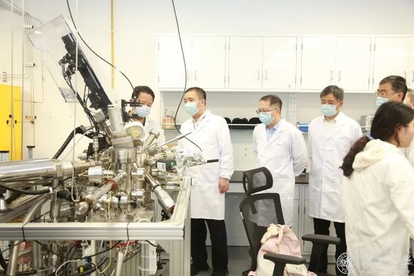 在低维复杂氧化物结构与物性实验室,金力慰问了沈健及团队师生,听取自行研发的脉冲激光沉积系统的相关介绍。在一号交叉学科楼微电子器件与量子计算机研究院,听取扫描隧道显微镜在微纳尺度研究材料的电子结构和输运特性的介绍。实验室里,一位博士生正在将样品从外面传到超高真空系统,在笔记本上记录下精确数据。