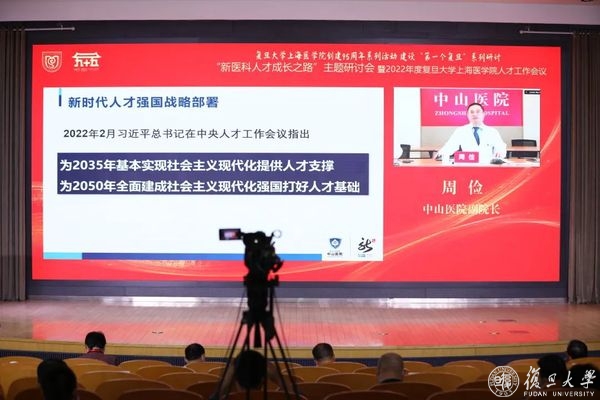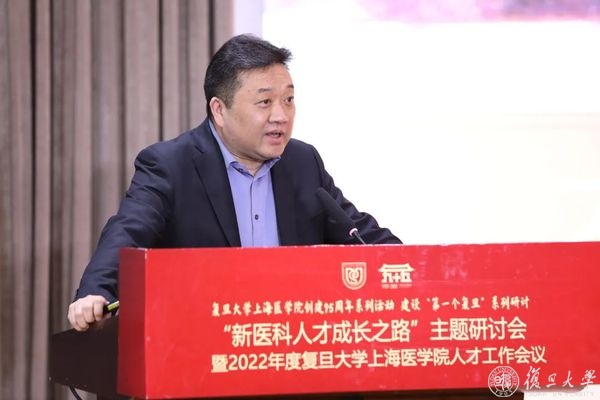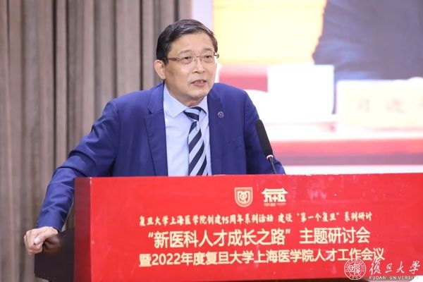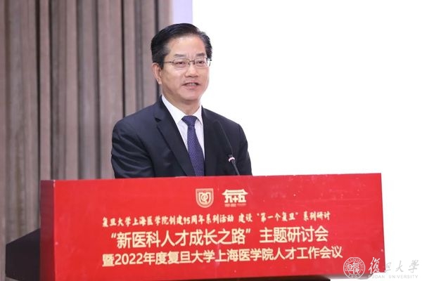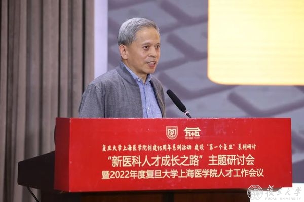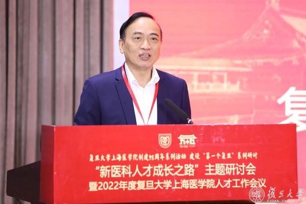 上午是“新医科人才成长之路”主题研讨会,上海市教育委员会副主任毛丽娟出席会议并致辞,复旦大学校长、上海医学院院长、中国科学院院士金力作主旨报告,复旦大学党委副书记、上海医学院党委书记袁正宏主持会议。