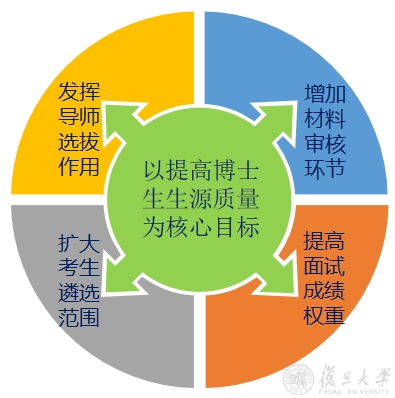 复旦大学在国内高校中最早试行“申请-考核”制选拔博士生,这一方式现已被国内高校普遍采用。“申请-考核”制与高层次创新型人才的培养规律和选拔要求相适应,充分发挥导师组作用,增加材料审核环节,扩大考生遴选范围,提高面试成绩权重,强化对考生科研创新能力与潜质的考查,生源质量明显提高。