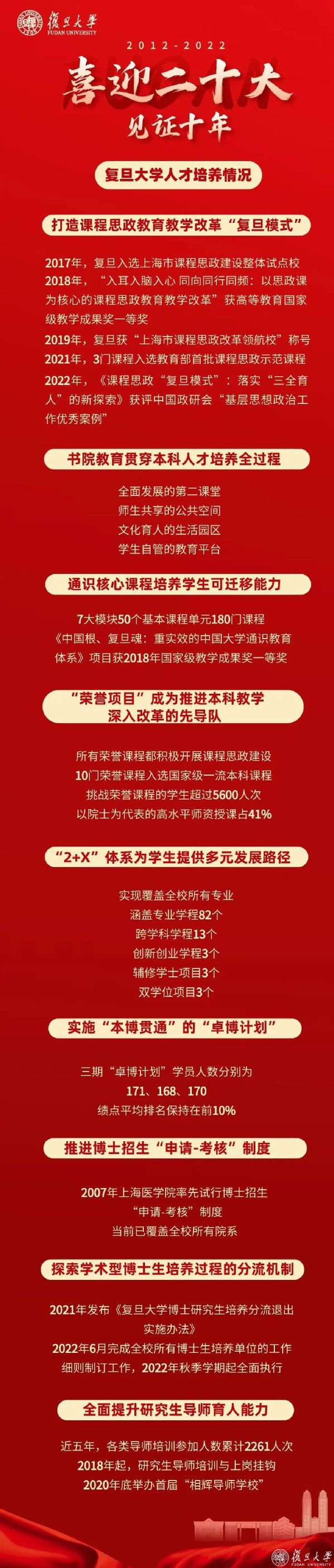 率先实施“一流本科教育提升行动计划”,“2+X”本科培养体系覆盖所有院系,数学等11个基地入选教育部基础学科拔尖学生培养计划2.0;率先实施“研究生教育博英计划”,加快培养高精尖缺人才……十年来,从2012年复旦“书院制”教育全面铺开、通识教育2.0改革建设深入推进,到2015年“荣誉项目”正式落地,到2018年“2+X”本科教学培养体系试点实施,再到2020年“研究生教育博英计划”,复旦落实立德树人根本任务,把人才培养和教育质量放在学校发展战略位置,扎实推进本科生、研究生教学改革,创新体制机制,努力培养掌握未来的复旦人。