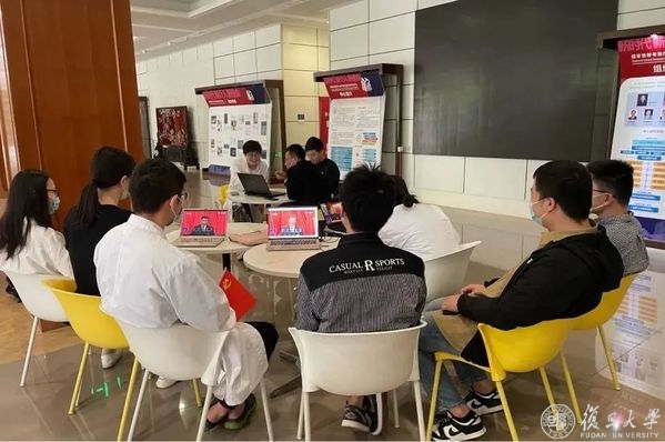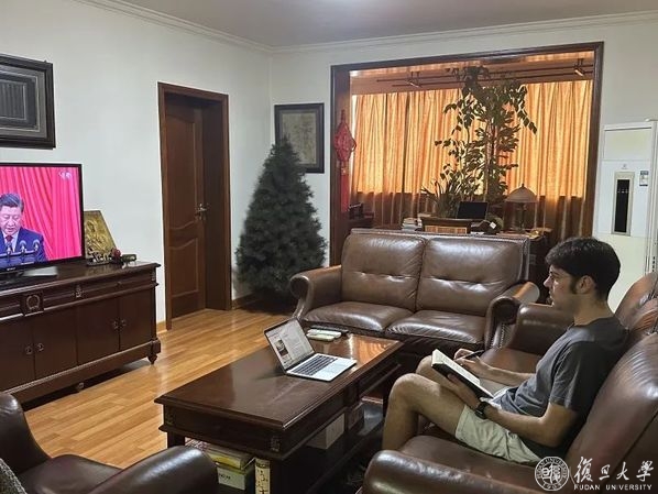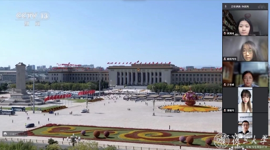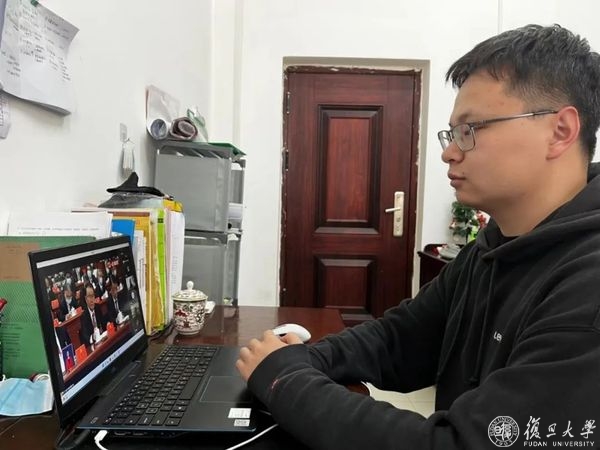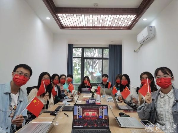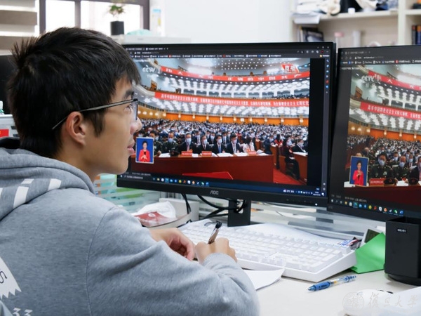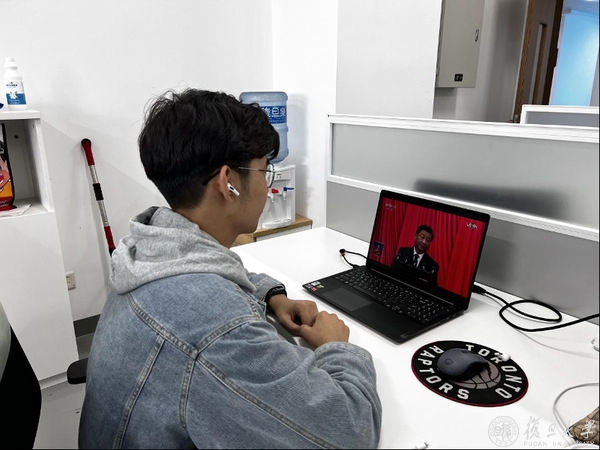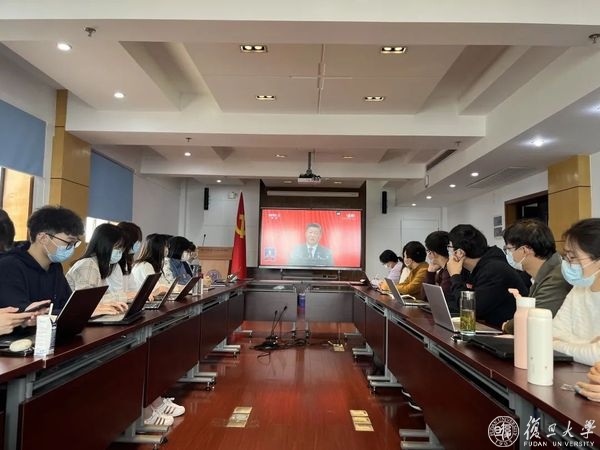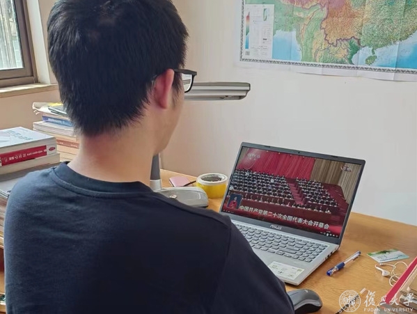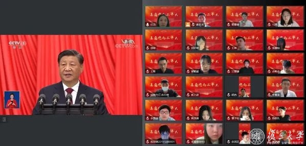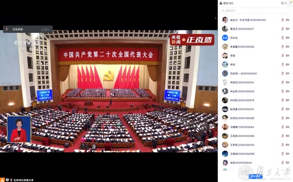 “线上+线下”学习,许多院系单位自发组织线上会议室,师生相聚在云端,共同收看党的二十大开幕。