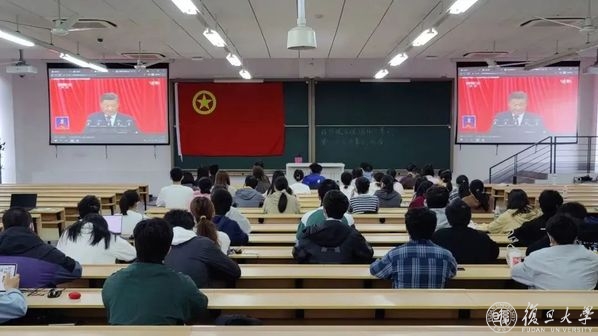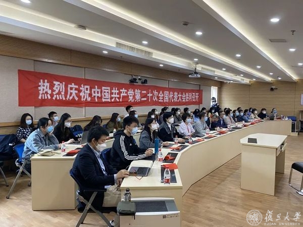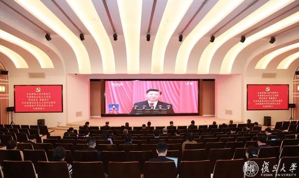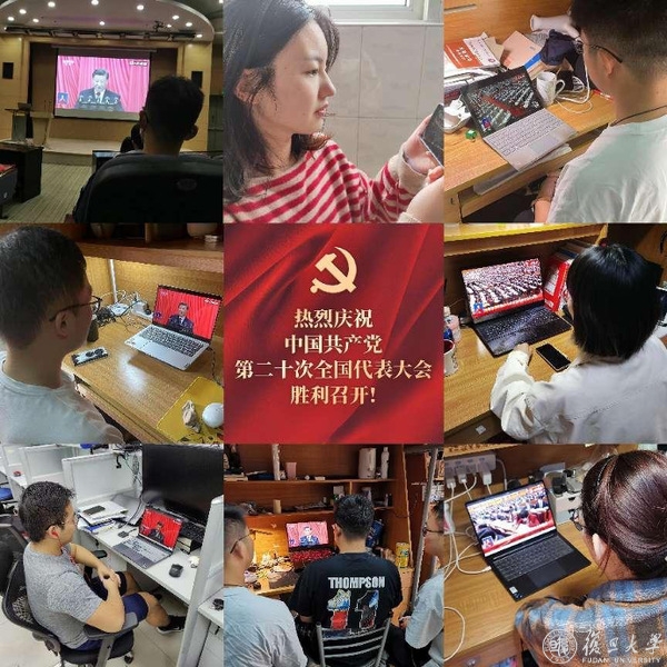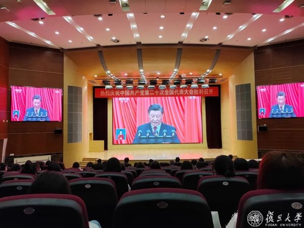 山河披锦绣,盛世写华章。今天,复旦园气氛热烈,复旦人心潮澎湃,喜迎党的二十大召开。在教学楼前,在报告厅里,横幅“热烈庆祝中国共产党第二十次全国代表大会胜利召开”,映衬着复旦人踔厉奋发、勇毅前行的决心。