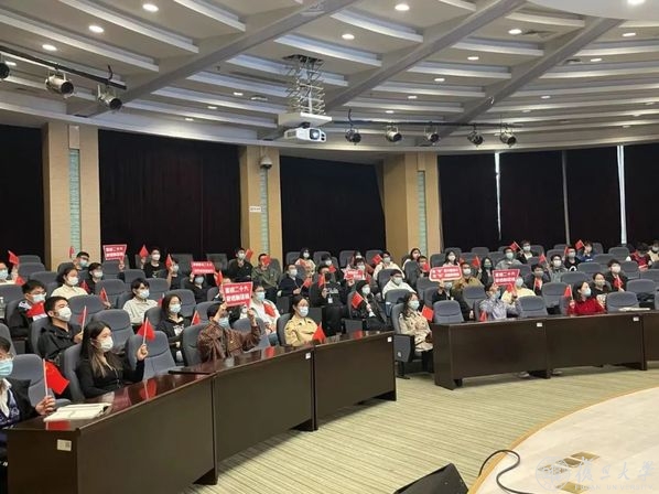 在江湾校区,在廖凯原法学楼一楼报告厅,学校部分机关干部、法学院的师生代表集体观看开幕大会。