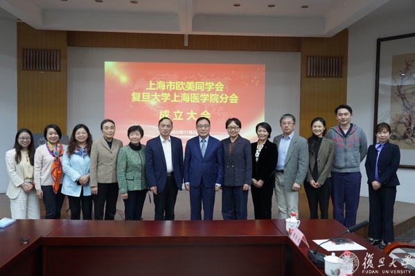 2022年11月2日下午,上海市欧美同学会(上海市留学人员联合会)复旦大学上海医学院分会成立大会在治道楼八角厅举行。市欧美同学会党组成员、常务副会长桂永浩,复旦大学党委副书记、上海医学院党委书记袁正宏,上海医学院党委副书记张艳萍,市欧美同学会徐汇分会会长周秀芬,徐汇区委统战部副部长、区侨办主任、区侨联党组书记张雪梅,复旦大学人类表型组研究院执行院长、市欧美同学会复旦大学分会副会长兼秘书长田梅,上海临床研究中心主任(院长)、原市欧美同学会复旦大学分会副会长、医药卫生二级分会会长朱畴文等出席会议。会议由张艳萍主持。