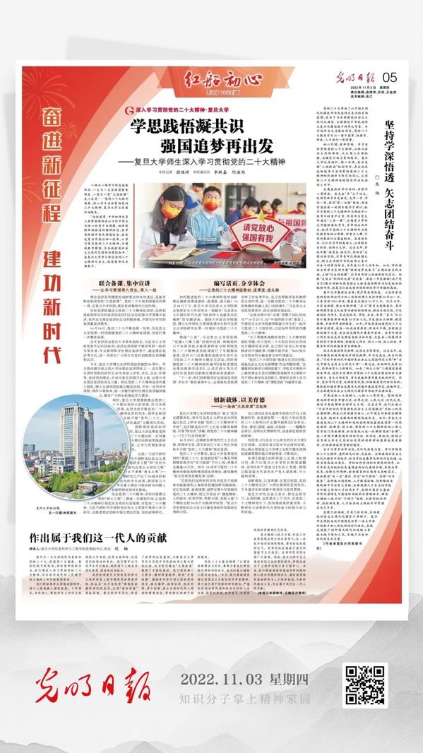 创新载体、以美育德,在复旦校园,党的二十大精神正以广大师生喜闻乐见的形式、于丰富多彩的场景中得到学习宣传贯彻。
