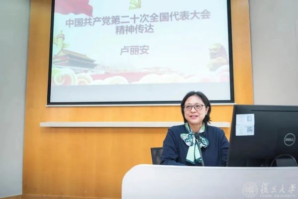 昨天(11月8日)下午,党的二十大代表、复旦大学外国语言文学学院教授、国际合作与交流处处长卢丽安在复旦大学经济学院作二十大精神宣讲,经济学院党委书记李粤江主持宣讲会。