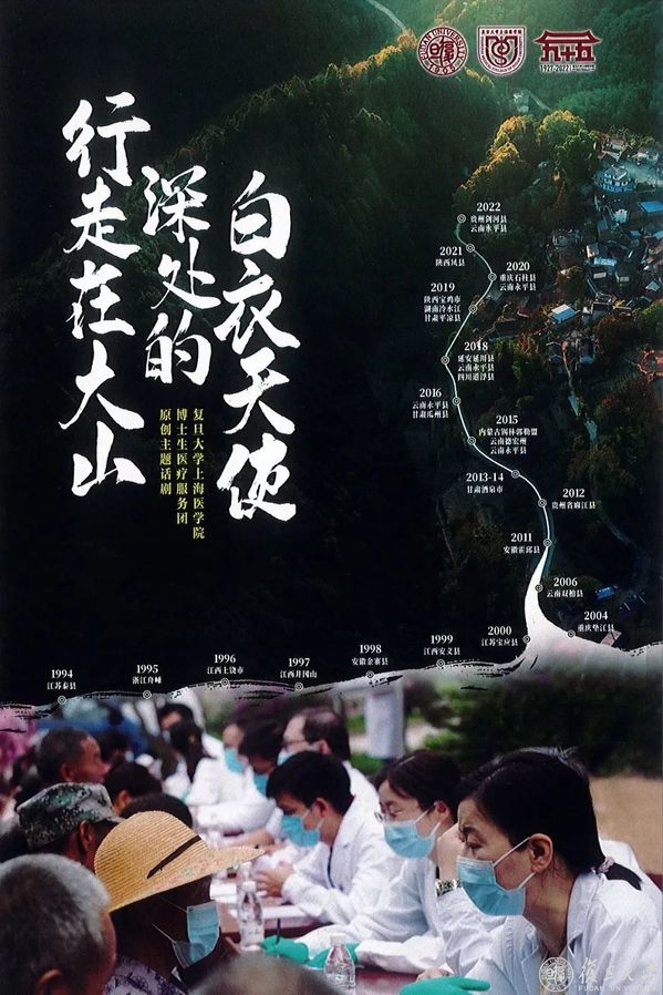 为人群服务,再现博医团故事。《行走在大山深处的白衣天使》以复旦上医“博士生医疗服务团”(以下简称“博医团”)自1994年成立以来的医疗志愿服务故事为原型改编,由复旦大学上海医学院党委指导、医学学工部策划编排,以医学生为主的复旦学生出演。此话剧作为纪念上医创建95周年的献礼,通过复旦和上医学子的演绎诠释,旨在赓续上医红色血脉,传承“为人群服务、为强国奋斗”的上医精神,展现国家脱贫攻坚取得的历史性成就,以及全面推进乡村振兴的必胜信心。观众们可以跟随剧情的不断推进,跨越数十年历史光阴,辗转祖国山河大地,感受“正谊明道”的医者初心。