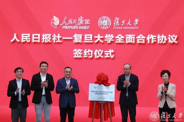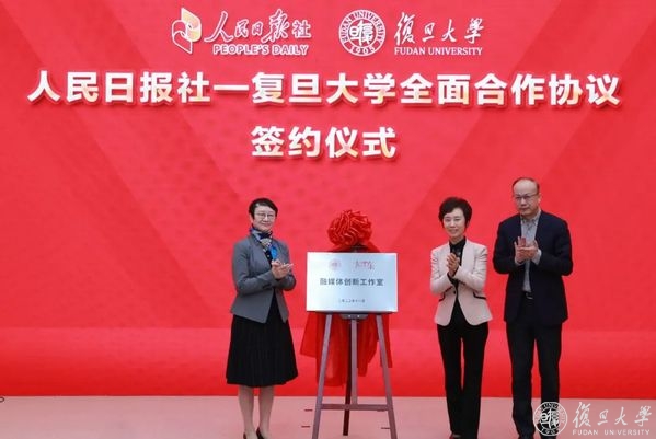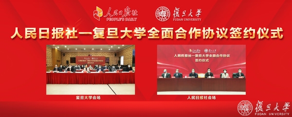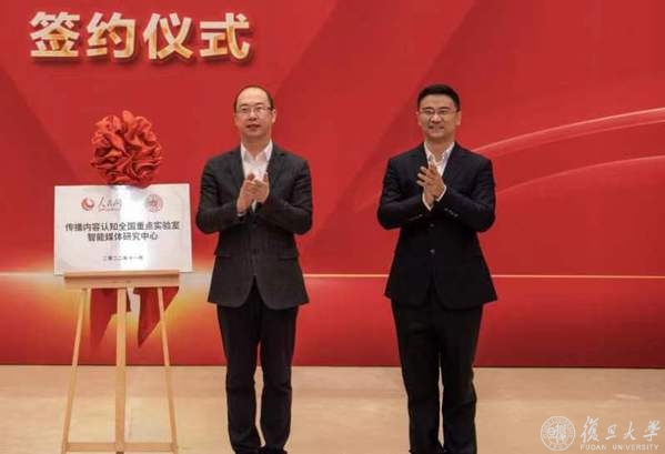 11月17日上午,人民日报社与复旦大学新一轮全面合作协议签约仪式以线上线下结合的方式举行。复旦大学党委书记焦扬、人民日报社副总编辑崔士鑫出席仪式并致辞。复旦大学党委常务副书记周亚明,人民日报社编委委员、秘书长程庆民分别代表学校和报社签署协议,大江东—复旦融媒体创新工作室、复旦大学—人民日报社传播内容认知全国重点实验室智能媒体研究中心揭牌。人民日报社地方部主任张忠,人民日报社对外交流合作部主任谢湘,人民日报社上海分社社长刘士安,人民网党委书记、董事长、总裁叶蓁蓁,人民日报社新闻协调部副主任姜赟,人民日报社上海分社副社长、大江东工作室主持人李泓冰出席签约仪式。签约仪式由复旦大学副校长陈志敏主持。人民日报社上海分社和人民网上海分公司相关负责人、记者,复旦大学相关部门和院系师生代表参加签约活动。