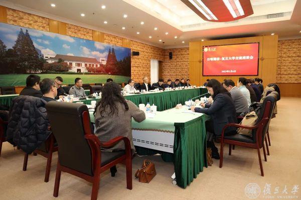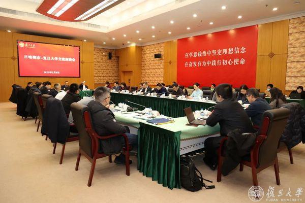 日喀则市-复旦大学交流座谈会在逸夫科技楼举行。复旦大学校长、中国科学院院士金力及相关负责人出席座谈会。会议由复旦大学党委常务副书记裘新主持。