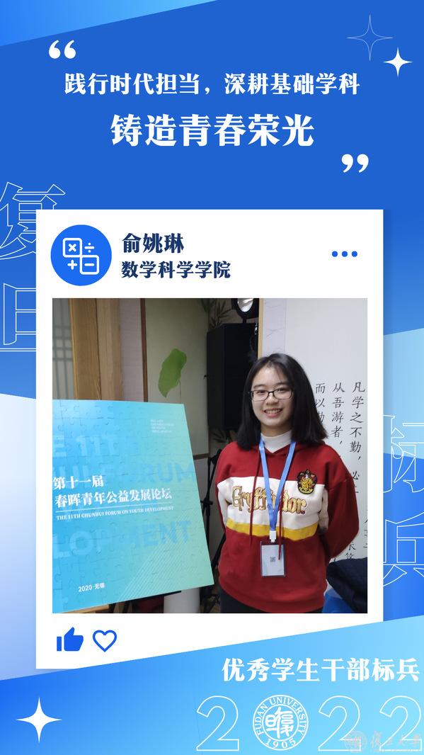 “感谢复旦这片沃土,让我在学生工作与数学学习中不断成长。”学旅不止,已入选复旦大学卓博计划的俞姚琳,希望在概率论与数理统计方向深入研究,提升自身科研能力。