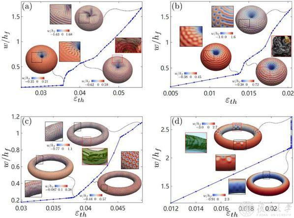 近日,航空航天系徐凡教授课题组揭示自然界中普遍存在的环形核壳结构(包含正、零、负高斯曲率)变形后会产生变曲率诱导的复杂表面褶皱斑图,建立了非线性环壳力学模型并解释了形貌弹性内在机制,绘制了多相模态共存相图。相关研究成果以“Curvature-Regulated Multiphase Patterns in Tori”为题发表于《物理评论快报》,并被美国物理学会、Nature、PhysOrg等期刊以研究亮点专文报道。